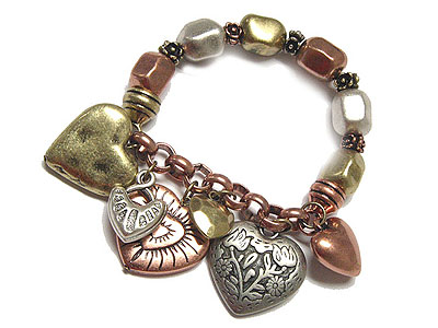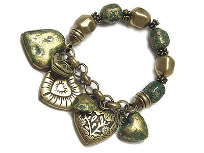 WHOLESALE ANTIQUE LOOK PATINA BEADS AND METAL HEART DANGLE STRETCH BRACELET 107201