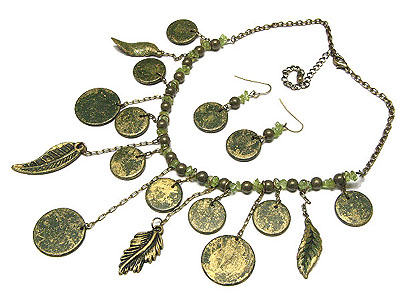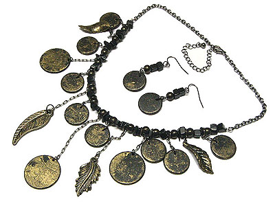 Burnish metal disk and leaves drop beads and chain necklace and earring set