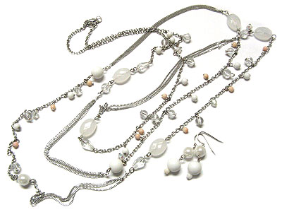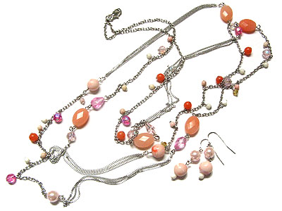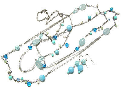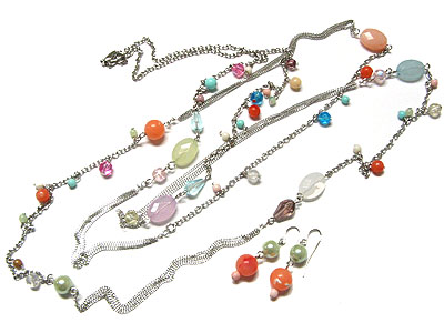 Mixed multi stone and beads long necklace and earring set