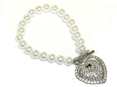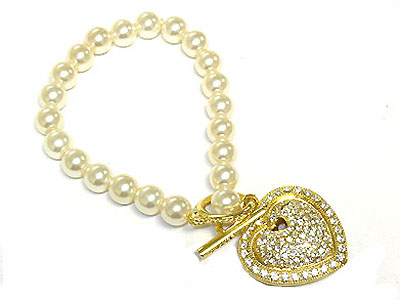 WHOLESALE PAVED CRYSTAL HEART CHARM AND GLASS PEARL BRACELET 157922