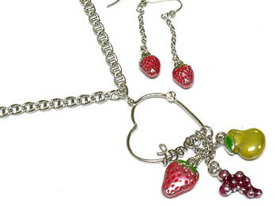 WHOLESALE STRAWBERRY GRAPE PEAR FRUIT CHARM NECKLACE AND EARRING SET 162125
