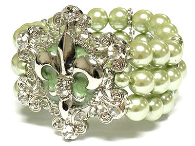 Crystal and metal deco fleur de lis triple line pearl stretch bracelet