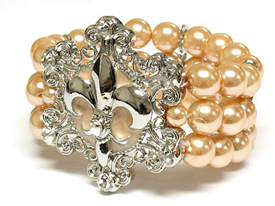 WHOLESALE CRYSTAL AND METAL DECO FLEUR DE LIS TRIPLE LINE PEARL STRETCH BRACELET 168154