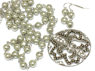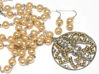 WHOLESALE CRYSTAL AND BEADS DECO ROUND FLEUR DE LIS PEARL NECKALCE AND EARRING SET 171992