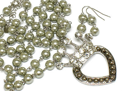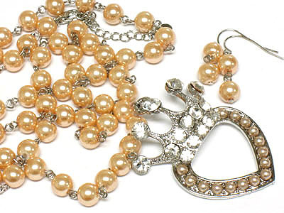 WHOLESALE CRYSTAL AND BEADS DECO HEART AND CROWN PEARL NECKALCE AND EARRING SET 171997
