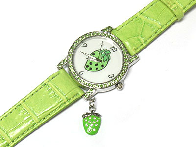 WHOLESALE CRYSTAL ROUND FACE STRAWBERRY DANGLE AND BACKGROUND LEATHER BAND WATCH 181187