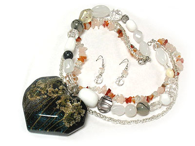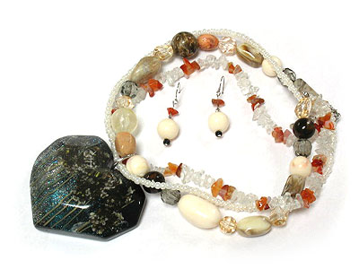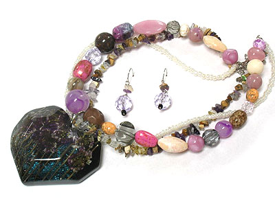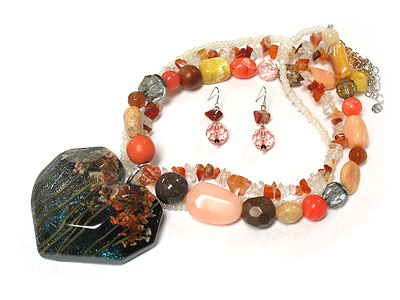 Art glass work heart peandant and multi row beads strand necklace and earring set