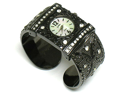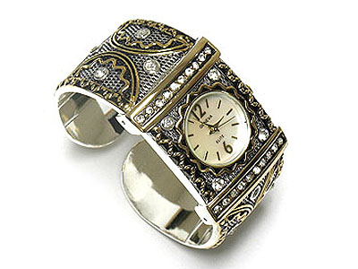 Antique style crystal stud metal filigree cuff watch