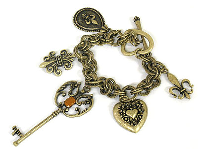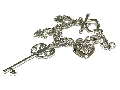 Multi key heart and fluer de lis toggle bracelet