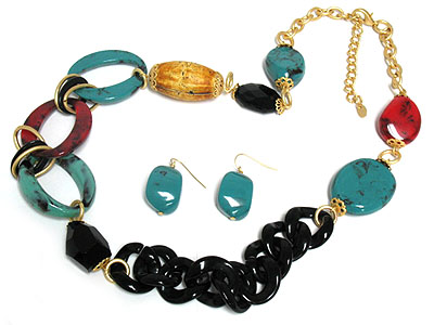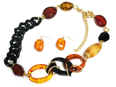 WHOLESALE NATURAL LOOKING FORMICA BEADS AND LINK NECKALCE AND EARRING SET - ANIMAL PRINT TONE 216833