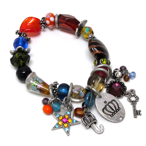 Genuine glass art beads and crystal crown and key charm stretch bracelet