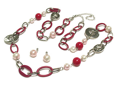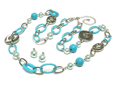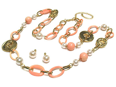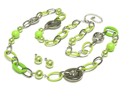Pastel tone spring color acryl and metal chain link long necklace and earring set