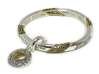 Bible phrase inscribed marcasite look metal filigree charm stretch bracelet