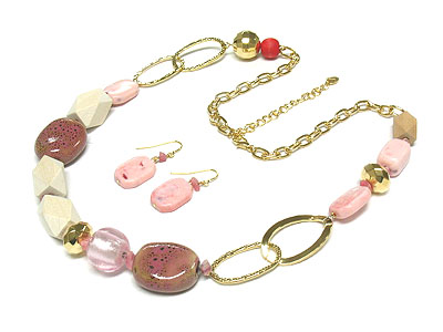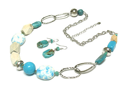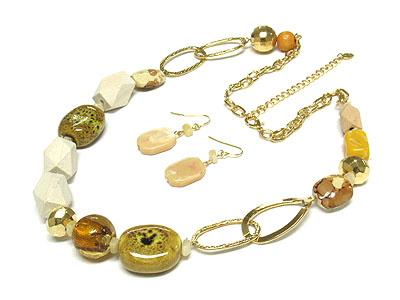 WHOLESALE MULTI AGATE STONE AND WOOD AND ACRYLIC BEAD NECKLACE AND EARRING SET 291920