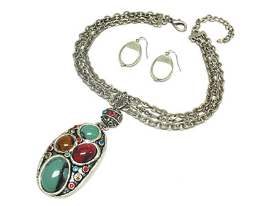 Natural stone and crystal oval pendant antique metal necklace and earring set