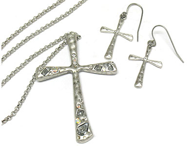 WHOLESALE CRYSTAL DECO ANTIQUE METAL CROSS PENDANT NECKLACE AND EARRING SET 306332