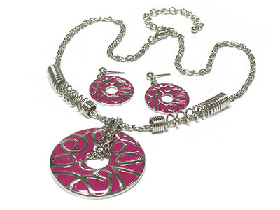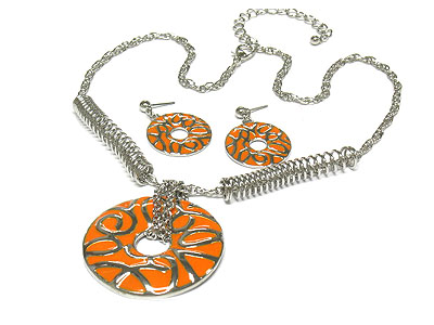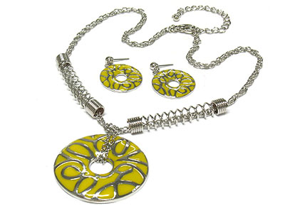 WHOLESALE PAINTED ROUND PENDANT AND DOUBLE METAL SPRING NECKLACE AND EARRING SET 306735