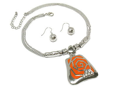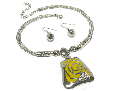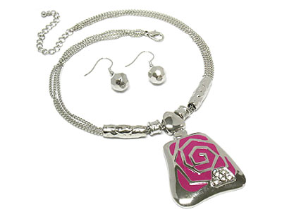 WHOLESALE CRYSTAL PAINTED ROSE PATTERN PENDANT AND TRIPLE STRANDS NECKLACE AND EARRING SET 306740