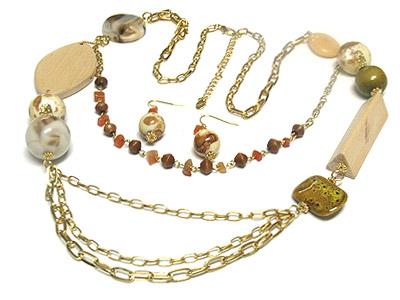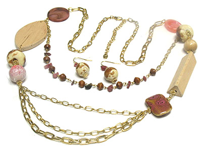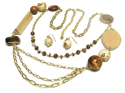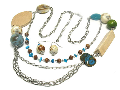 Multi strands glass ball and multi woo deco long necklace and earring set