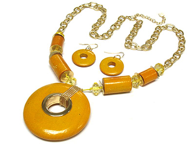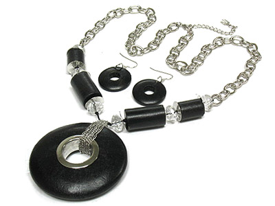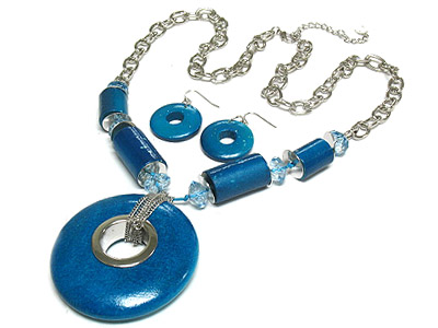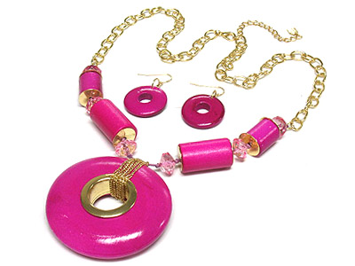 WHOLESALE LARGE WOOD DONUT PENDANT AND ACRYL BEAD NECKLACE AND EARRING SET 317499