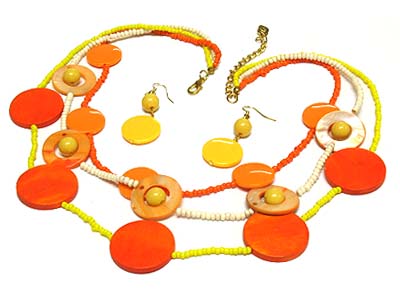 WHOLESALE TRIPLE STRAND WOOD AND ACRYL AND SHELL DISK AND SEED BEAD NECKLACE AND EARRING SET 328330