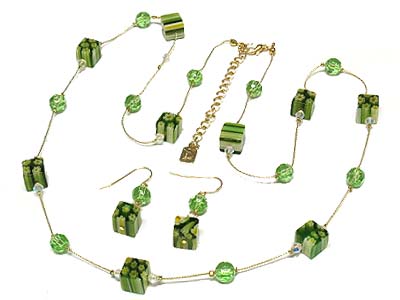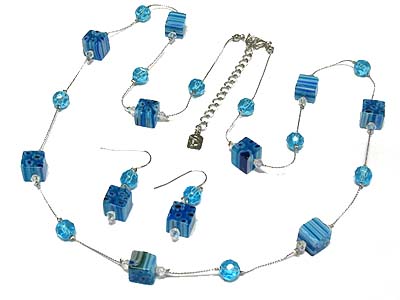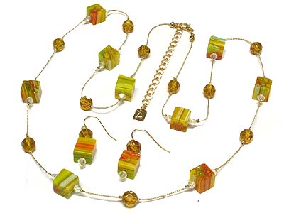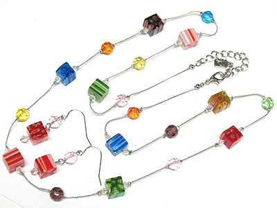 WHOLESALE MULTI SQUARE MARBLE AND ACRYLIC BEAD LONG NECKLACE AND EARRING SET 328410