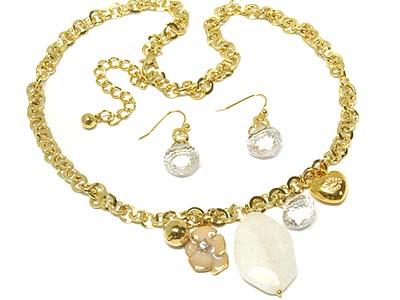 Precious stone nugget epoxy flower and casting heart deco chain necklace and earring set
