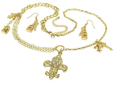WHOLESALE CRYSTAL FLEUR DE LIS PENDANT AND LOCK AND KEY CHARMS NECKLACE AND EARRING SET 328519