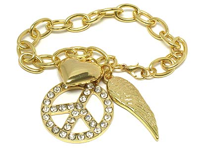 Crystal peace and wing and heart bracelet