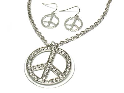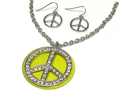 WHOLESALE EPOXY COVERD ROUND DISK THAT HAS MIRROR AT THE BACK AND CRYSTAL PEACE PENDANT NECKLACE AND EARRING SET 328572
