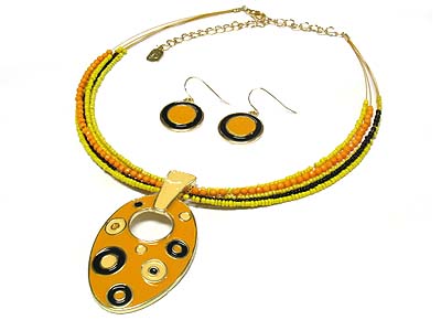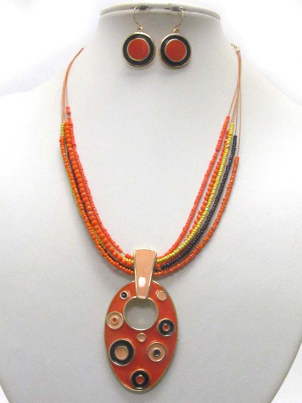 WHOLESALE EPOXY METAL OVAL PENDANT AND MULTI SEED BEAD STRANDS NECKLACE AND EARRING SET 328622