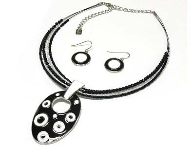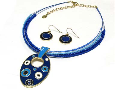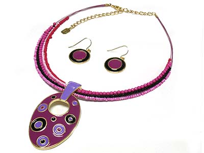 Epoxy metal oval pendant and multi seed bead strands necklace and earring set