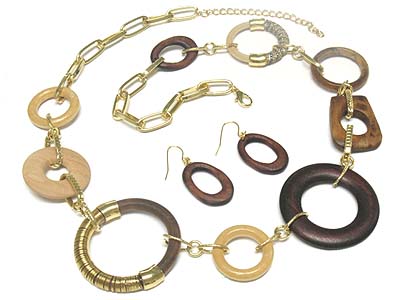 WHOLESALE MULTI WOOD RING LINKED METAL CHAIN LONG NECKLACE AND EARRING SET 328876