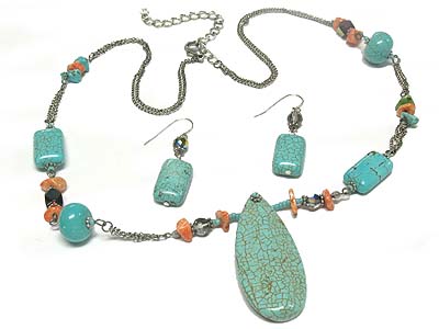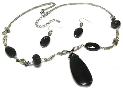 WHOLESALE SEMI PRECIOUS STONE PENDANT AND ACRYL BEAD DOUBLE STRANDS NECKLACE AND EARRING SET - AGATE 328977