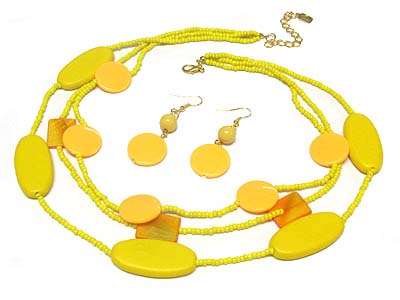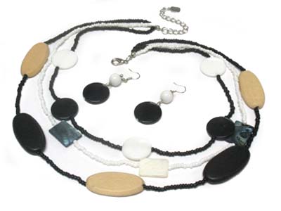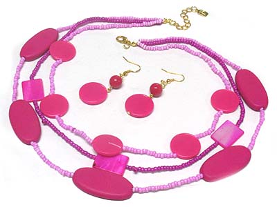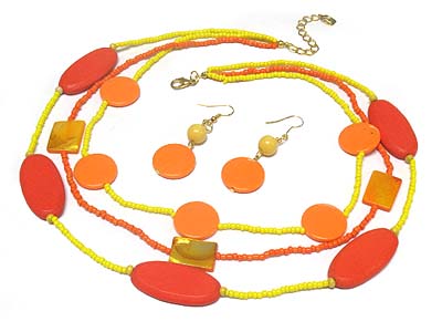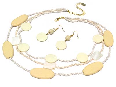 WHOLESALE WOOD SHELL AND ACRYL LINK SEED BEAD TRIPLE STRANDS NECKLACE AND EARRING SET 329328