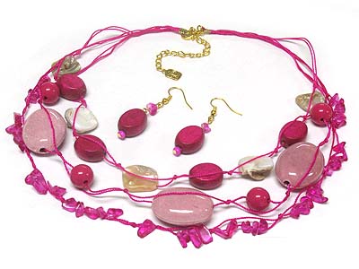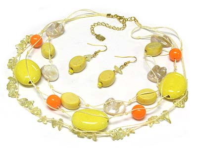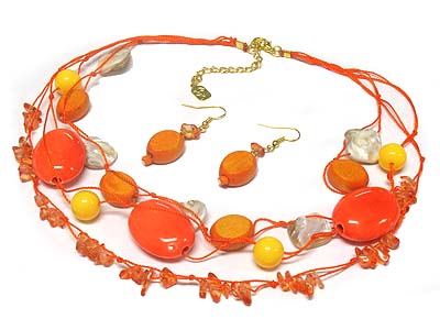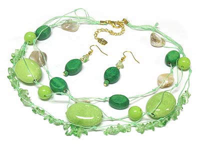 Acryl nugget and wood bead shell harmony triple cord necklace and earring set