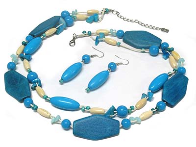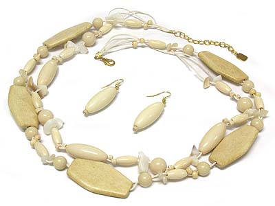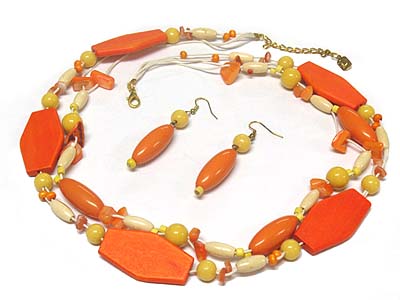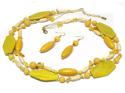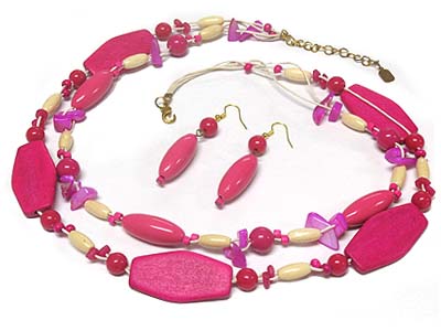 WHOLESALE MULTI WOOD NUGGET AND ACRYL AND WOOD BEAD LINK DOUBLE NECKLACE AND EARRING SET 329520