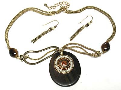 WHOLESALE SEED BEAD DECO WOOD DISK AND DOUBLE MESH CHAIN NECKLACE AND EARRING SET 329826