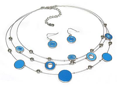 WHOLESALE EPOXY COVERED ROUND METAL DISK AND METAL BEAD TRIPLE STRANDS NECKLACE AND EARRING SET 330008