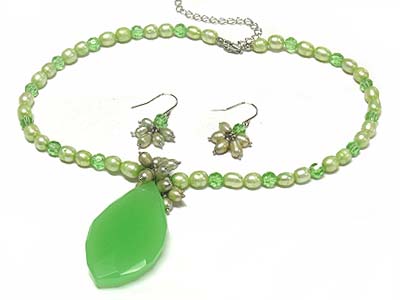 Facet semi precious stone and genuine fresh water pearl necklace and earring set