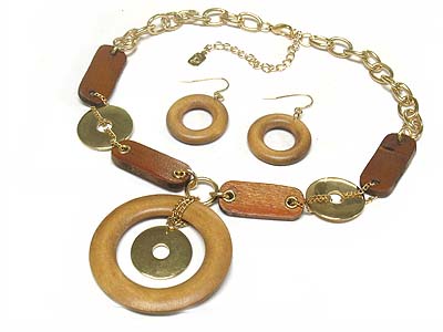 WHOLESALE WOOD DONUT AND METAL ROUND DISK PENDANT NECKLACE AND EARRING SET 330319