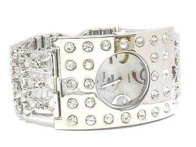 Crystal stone deco large face leather band watch