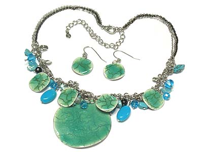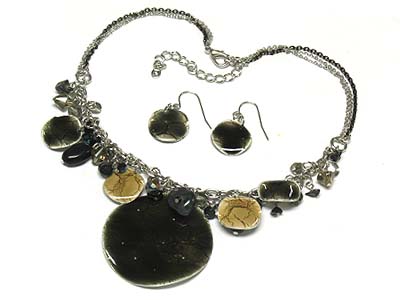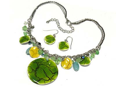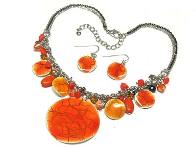 WHOLESALE METAL BENT ROUND DISK PENDANT AND ACRYL CHARM MULTI STRANDS NECKLACE AND EARRING SET 330504