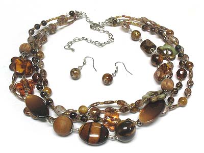 WHOLESALE MULTI FLORAL GLASS AND WOOD BEADS AND LOOKING PATINA LINK SEED BEAD NECKLACE AND EARRING SET 331782