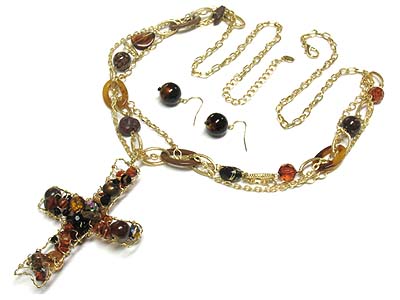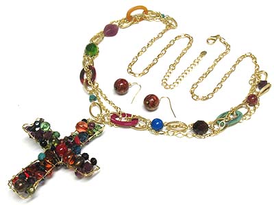 WHOLESALE TWISTED WIRE AND GLASS BEADS DECO CROSS PENDANT NECKLACE AND EARRING SET 331823