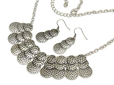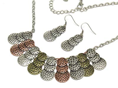 Multi tri golf ball pattern round disk drop necklace and earring set