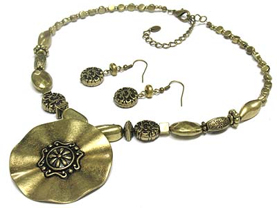 WHOLESALE METAL FILIGREE ROUND DISK PENDANT NECKLACE AND EARRING SET 331843