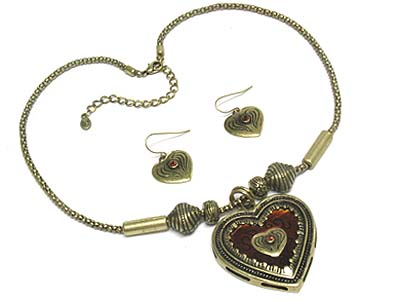 WHOLESALE CRYSTAL PAVED ANTIQUE STYLE HEART PENDANT METAL NECKLACE AND EARRING SET 332066