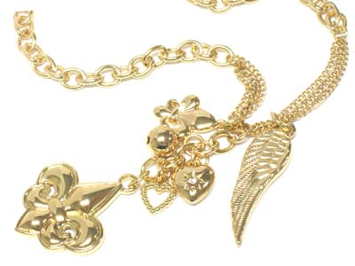 Metal fleur de lis and multi charms and chains necklace