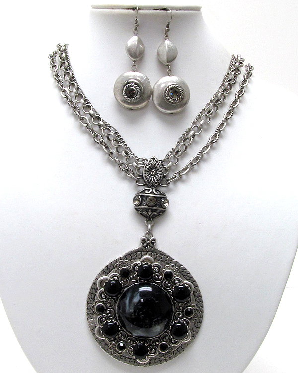 WHOLESALE BOUTIQUE STYLE GENUINE STONE DECO ANTIQUE ROUND METAL DISK PENDANT NECKLACE AND EARRING SET - ONYX 332611
